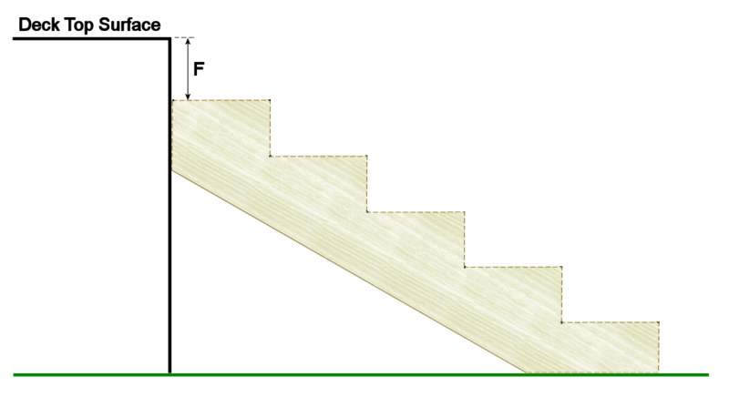 | 11. Attach to deck. Stringer will be attached [F] inches down from the top edge of the deck. |